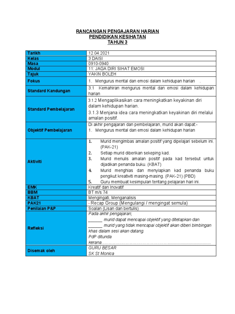 Rancangan Pengajaran Harian Pendidikan Kesihatan Tahun 3 Tarikh Kelas Masa Modul Tajuk Fokus Standard Kandungan Pdf