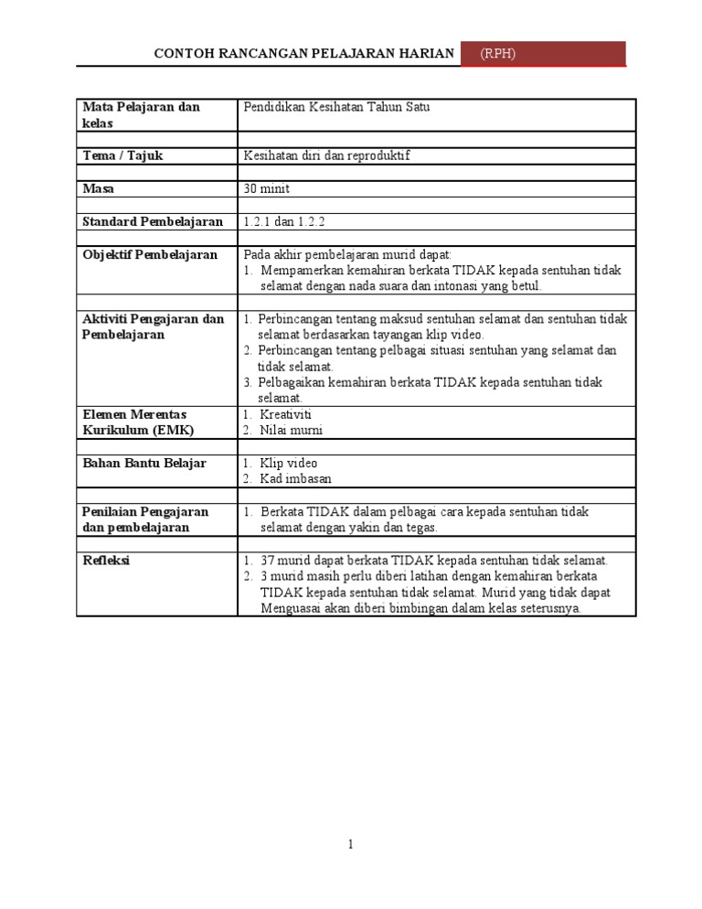 Berkata TIDAK kepada sentuhan tidak selamat. RPH Pendidikan Kesihatan Tahun 3 - Sumber Pendidikan 19. RPH dalam bentuk SOFTCOPY MSWORD.