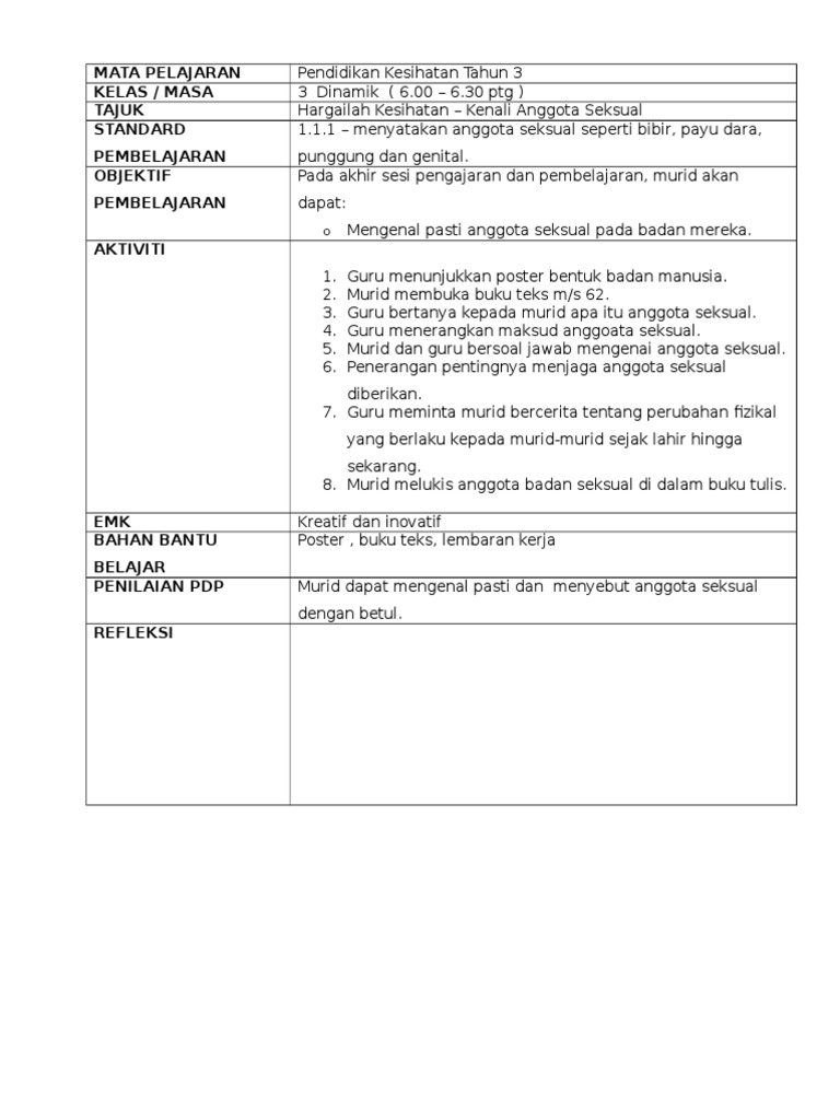 Tajuk TIDAK SIHAT TIDAK SELAMAT. Pengajaran Harian RPH membantu guru menyampaikan isi kandungan pelajaran dengan mudah. Tajuk KENALI ANGGOTA SEKSUAL.